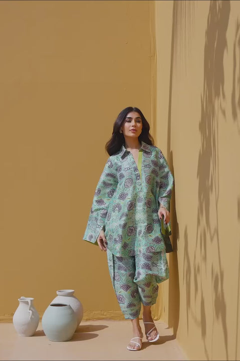 Rendered in a lustrous icy aqua, this contemporary pure rawsilk co ord set exudes relaxed sophistication. The oversized shirt is defined by architectural detailing, with a sharp collar, a striking lime contrast placket, and wide flared sleeves. Stylised floral motifs in deep violet add rhythmic interest to the fabric’s subtle sheen. Paired with a matching shalwar finished with a pleated hem, the look maintains its breezy, fluid silhouette.