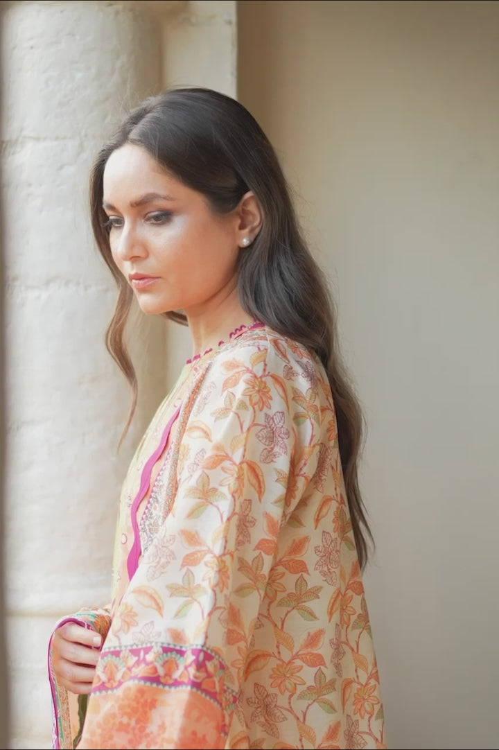 A classic silhouette is adorned with a sunlit apricot and verdant sage print, framed with intricate floral accents and scalloped crimson 3D detailing. The khaddi silk shirt is paired with pure rawsilk culottes and a cascading medium silk dupatta, exuding timeless charm.