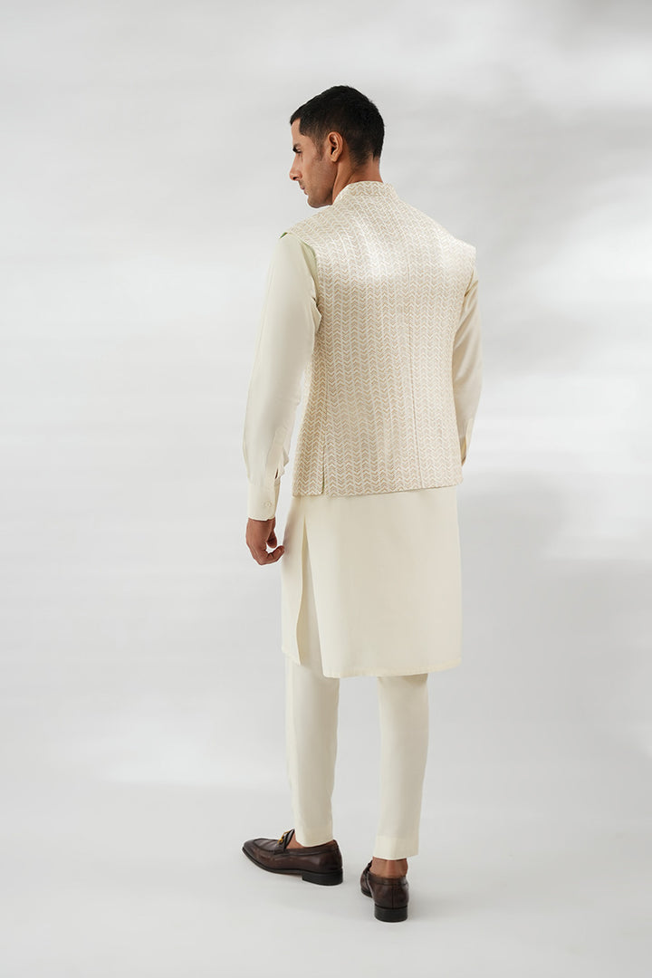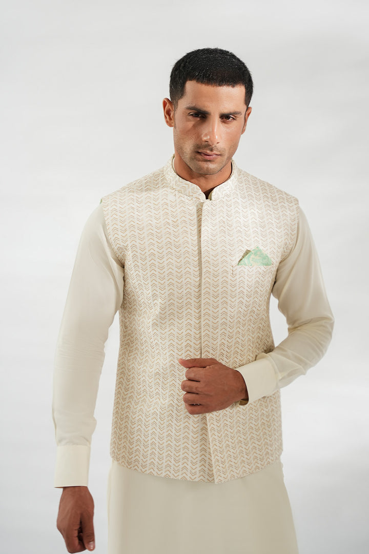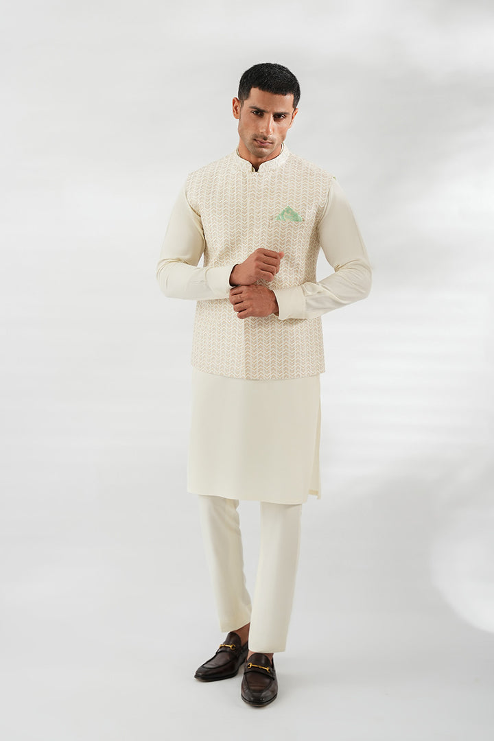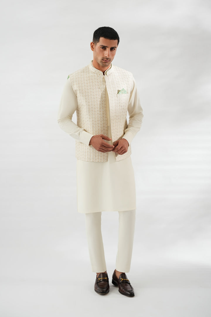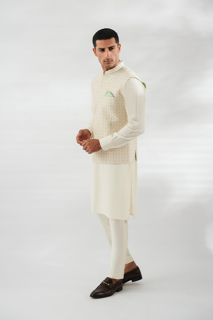 In refined ivory, this boski kurta set is paired with a raw silk waistcoat, embroidered with geometric patterns that lend subtle depth and texture. The tailored silhouette with its mandarin collar is finished with a neatly folded aqua-printed pocket square, striking a note of understated sophistication.