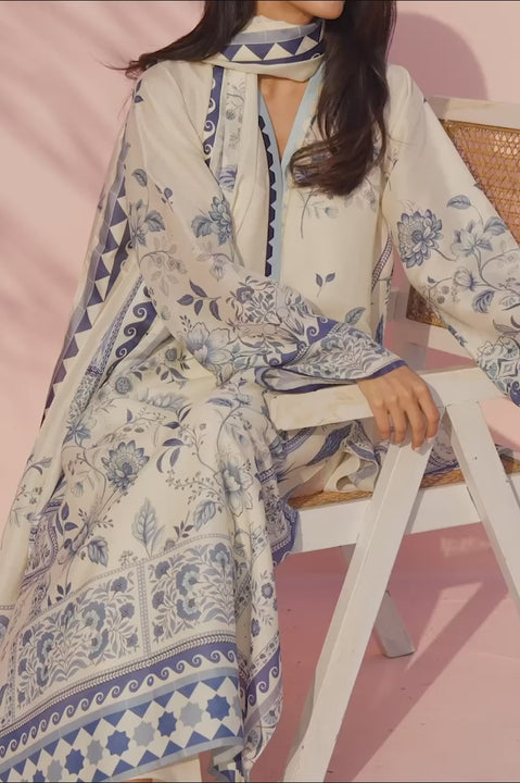 An elegant ivory toned ensemble featuring a relaxed A line khaddi silk kurta, adorned with intricate cobalt blue botanical embroidery and decorative floral motifs. The design is accented by a classic V neckline with a contrasting azure border and wide flared sleeves detailed with a mix of geometric and floral patterns. Paired with ivory hued pure rawsilk culottes finished with horizontal pleat detailing, the look is completed with a coordinating printed medium silk dupatta framed by a bold azure border for a breezy, sophisticated finish.