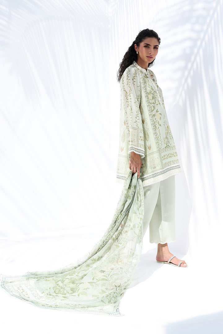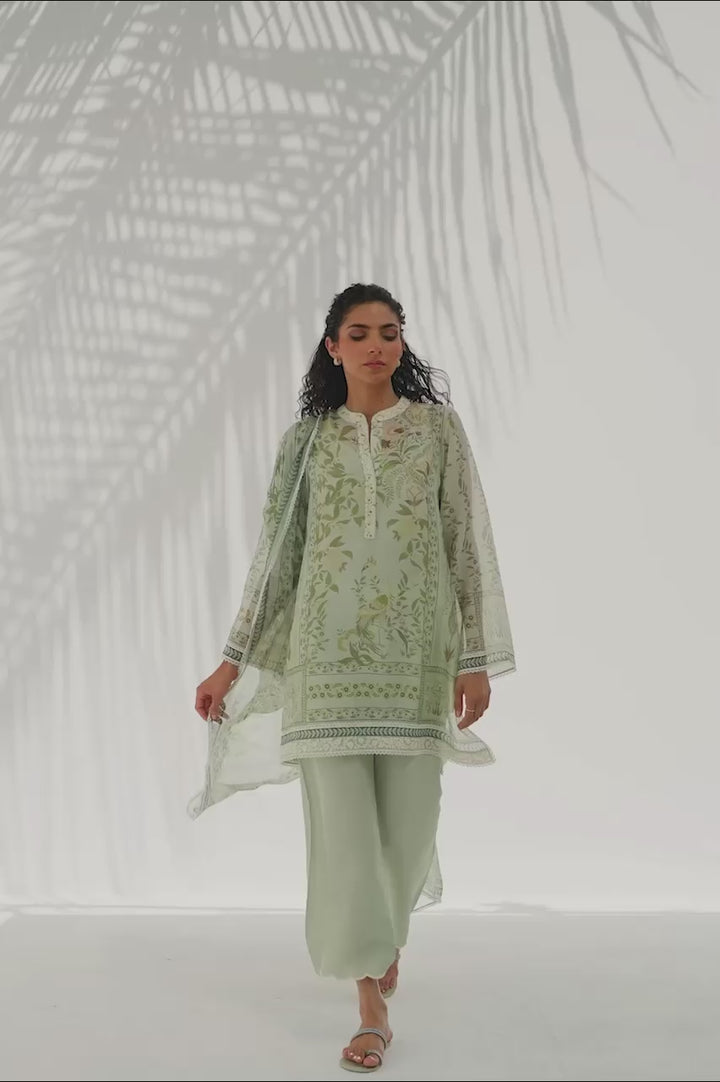 In a fresh pistachio hue, this ensemble radiates breezy elegance. The cotton net shirt features a soft botanical print and finely embroidered vines, while ivory lace trims the neckline and hem with delicate precision. Paired with pure Raw Silk culottes edged in scalloped embroidery, the look is finished with a sheer chiffon dupatta patterned in complementary tones.