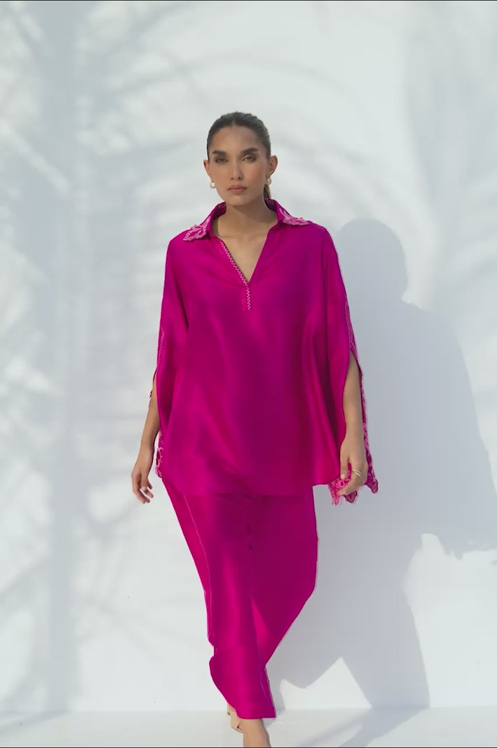 Commanding attention in a vibrant fuchsia-hued pure Raw Silk, this ensemble offers a contemporary silhouette. A relaxed shirt with a V-neck collar and voluminous cape sleeves is detailed with intricate cutwork embroidery and appliqué. Paired with a draped shalwar, the look balances ease with vibrant color and delicate craftsmanship.