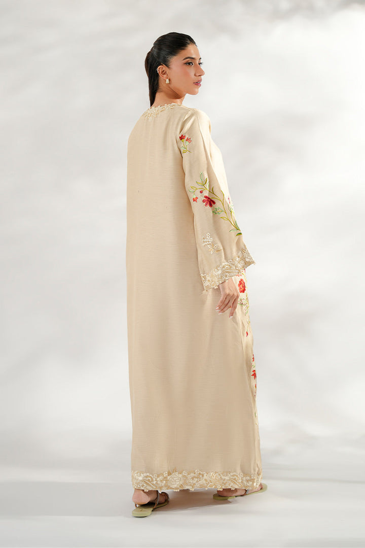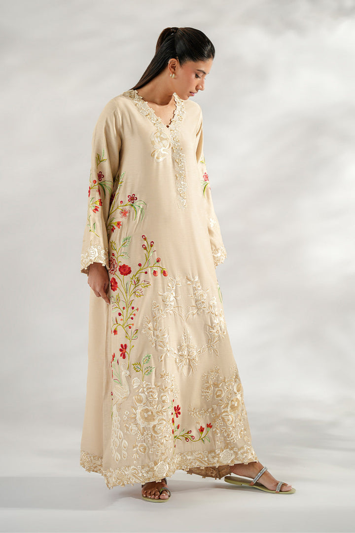 A luminous sand hued khaddi silk kaftan is embroidered with delicate ivory florals and vibrant scarlet blooms, evoking painterly elegance. Intricate resham work cascades into a breathtaking menagerie of avian and botanical motifs, with a statement peacock embellished along the side slits. Fabric manipulation elevates the V-shaped neckline and sleeves, featuring tonal floral embroidery that climbs toward the shoulders, imitating thriving vines.