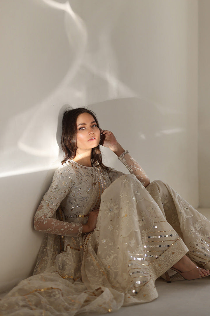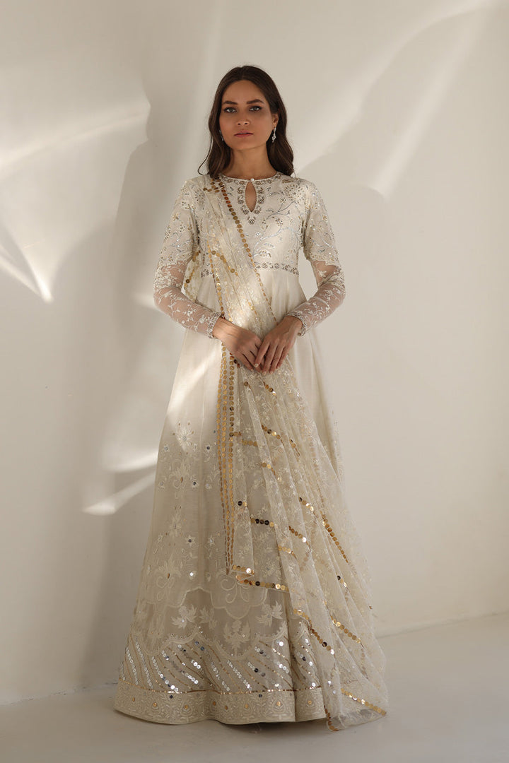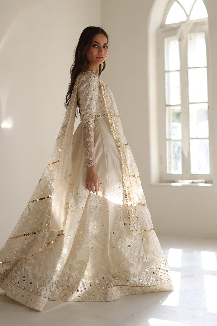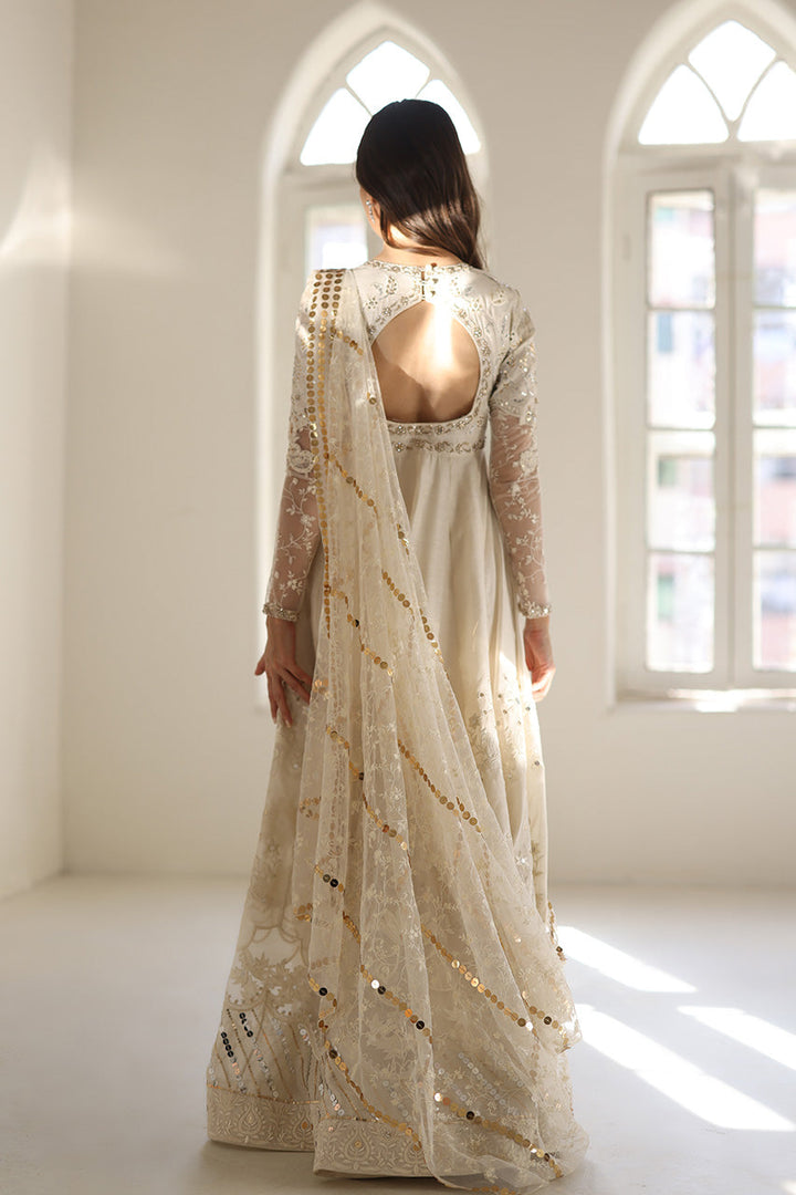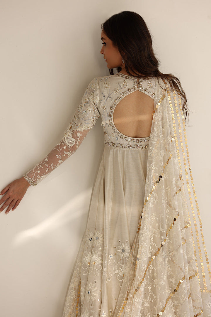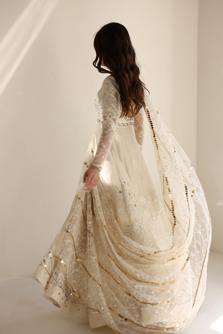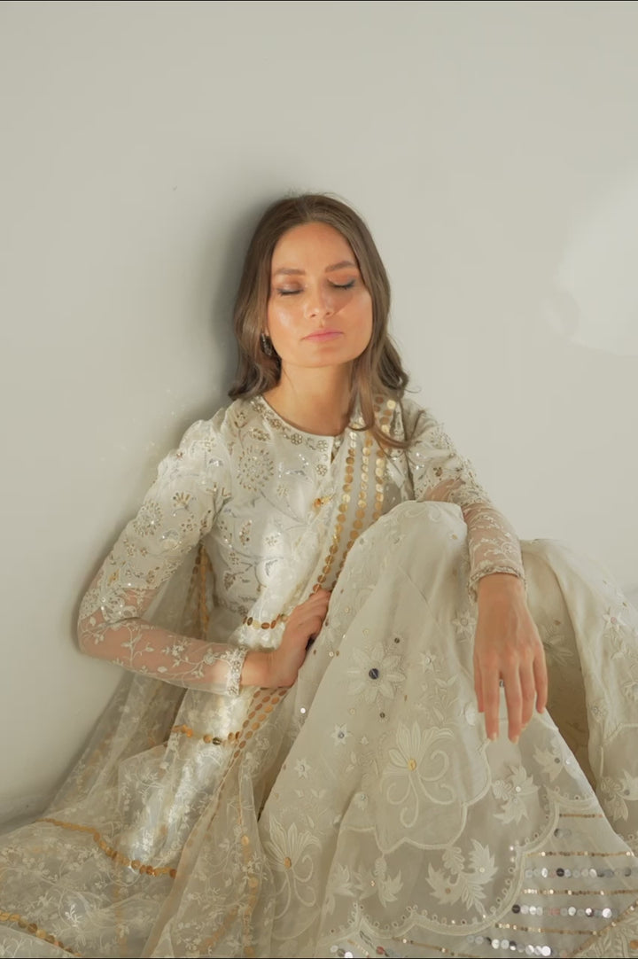 Radiating luxury in a soft ivory hue, a french tulle and khaddi silk peshwas is a vision of timeless glamour. The flared silhouette is adorned with intricate resham floral embroidery and gold sequin detailing. Zardoze embellishment elevates the keyhole neckline and back, enhancing the regal allure. Paired with a pre draped french tulle dupatta featuring floral and sequin details.