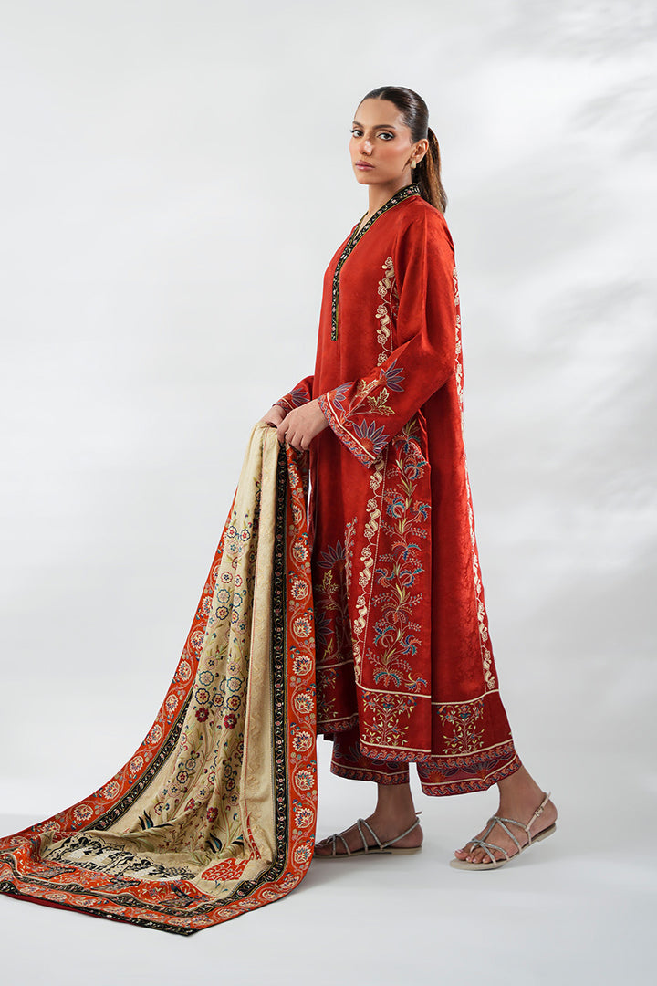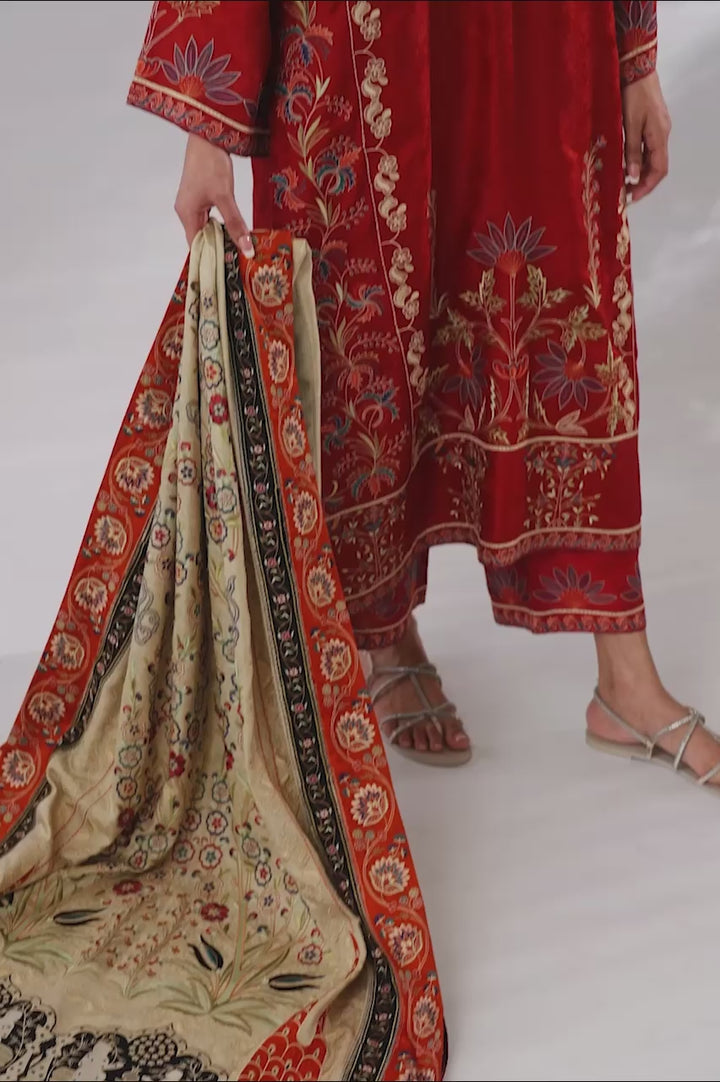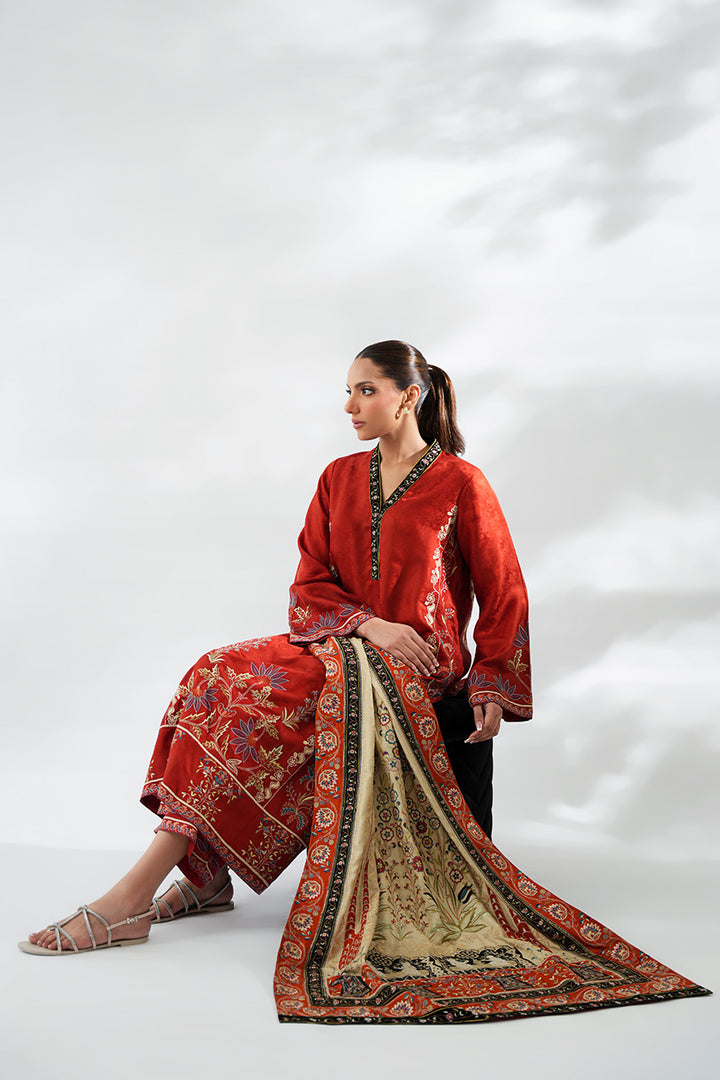 An intricately crafted kurta in burnished terracotta self-jamawar is tailored in a straight silhouette, adorned with gilded threadwork florals along the hem and sleeves. The neckline is finished with a contrasting embroidered placket that adds a touch of refinement. It is paired with matching pure Raw Silk pants, subtly accented with delicate borders. The ensemble is completed with a signature self-jamawar shawl, embellished in earthy tones and framed with ornate motifs, velvet applique, and intricate borders, paying homage to timeless artistry.