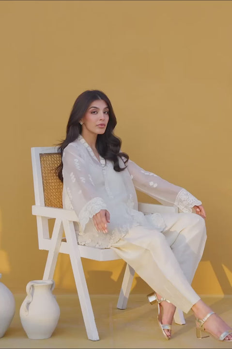 Radiating a luminous, ethereal charm, this ivory hued ensemble features an oversized sheer organza shirt, meticulously embellished with tonal floral aari work and scattered embroidery. The silhouette is defined by a bold V neckline framed with floral motifs, layered over a matching crepe camisole for a refined play on transparency. Statement sleeves and a scalloped hem lend textured depth, while lustrous pure rawsilk shalwar adds a fluid, modern drape, completing the monochromatic look with effortless grace.