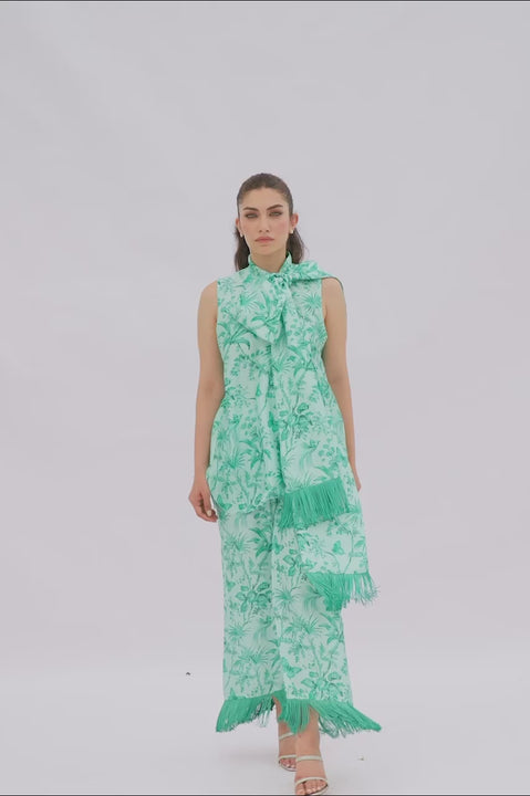 A study in sculpted grace, this pure rawsilk ensemble is imagined on a seafoam canvas etched with botanical motifs that recall the quiet poetry of a toile de Jouy garden. The sleeveless shirt falls in a straight line, its neckline accented with an oversized bow that drapes into long fringed panels. Paired with culottes edged in tonal fringe, the look captures a balance of modern minimalism and painterly romance through its fluid lines and tactile details.