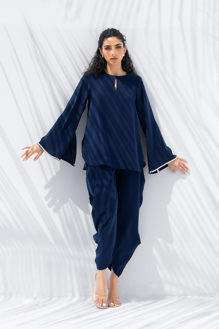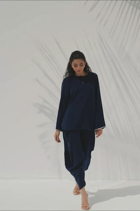 Exuding sophisticated flair in rich midnight blue Italian crepe, this ensemble offers a contemporary take on classic tailoring. The relaxed top features flared full sleeves, subtly accented at the cuffs with delicate diamanté embellishment. Paired with a softly draped shalwar in a matching hue that gathers gracefully at the ankle, the look is defined by clean lines, tonal depth, and effortless fluidity.