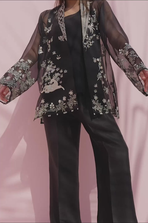 An ebony hued front open organza jacket in a relaxed silhouette, intricately adorned with ivory nature inspired embroidery and delicate sleeve detailing, finished with a statement embellished collar. Layered over a tonal pure rawsilk tube top and paired with pure rawsilk wide leg trousers/bootcut pants, the look delivers a refined monochromatic appeal.