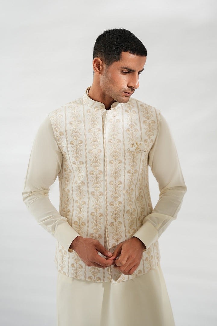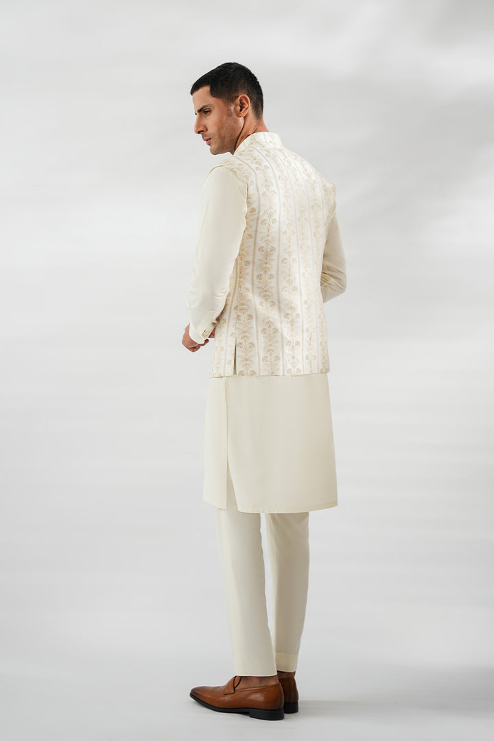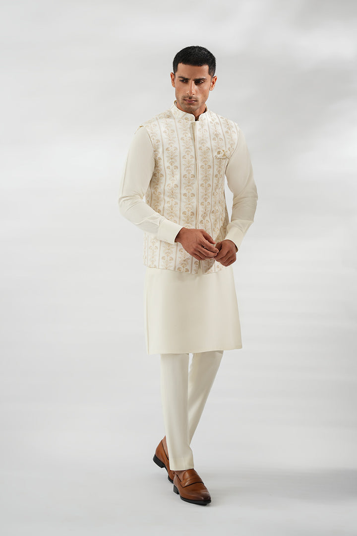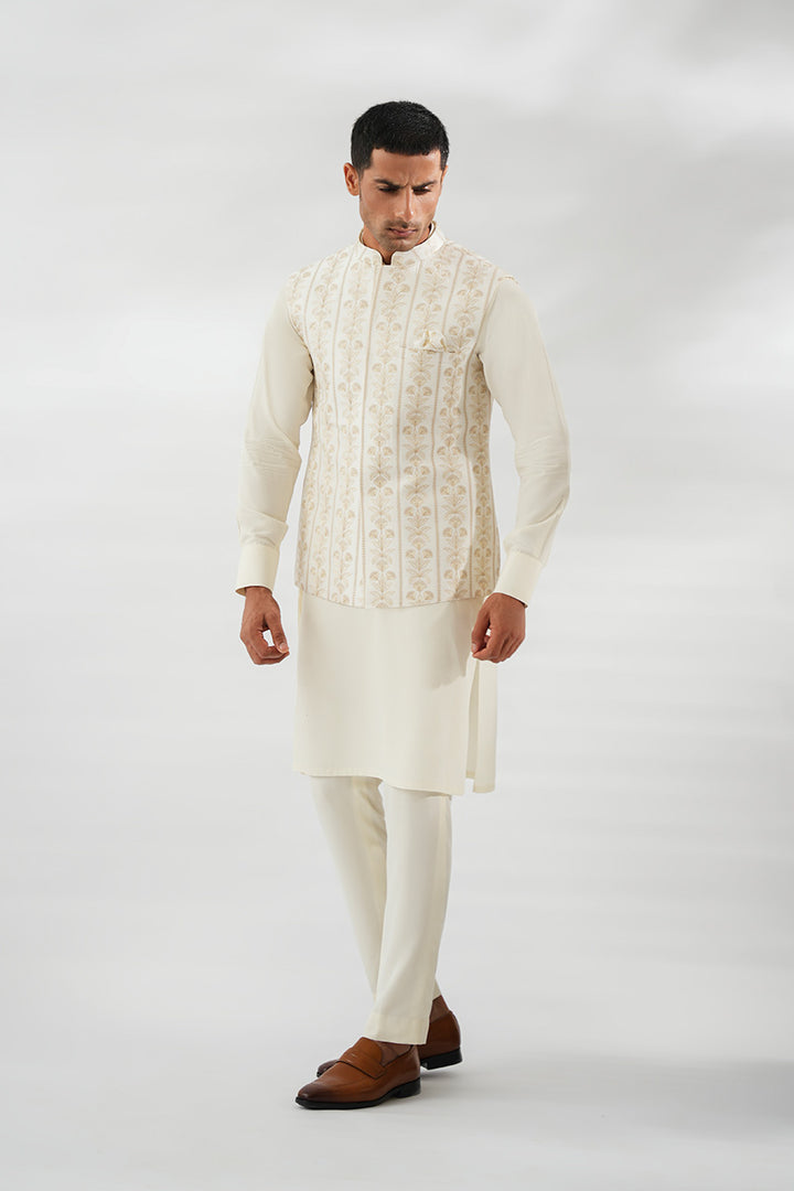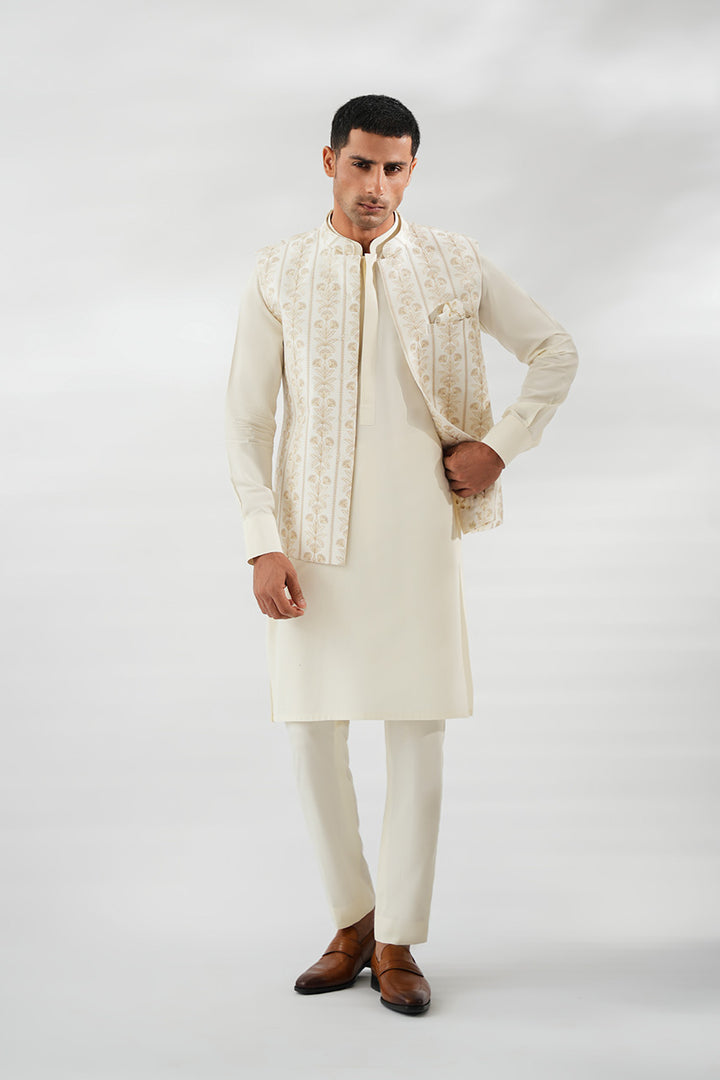 Effortlessly refined, this ivory kurta set is paired with a front-open waistcoat adorned with delicate taupe-toned embroidery. The clean lines of the Boski kurta and pants provide a timeless foundation, while the intricately patterned waistcoat with a matching pocket square adds sophistication and depth.